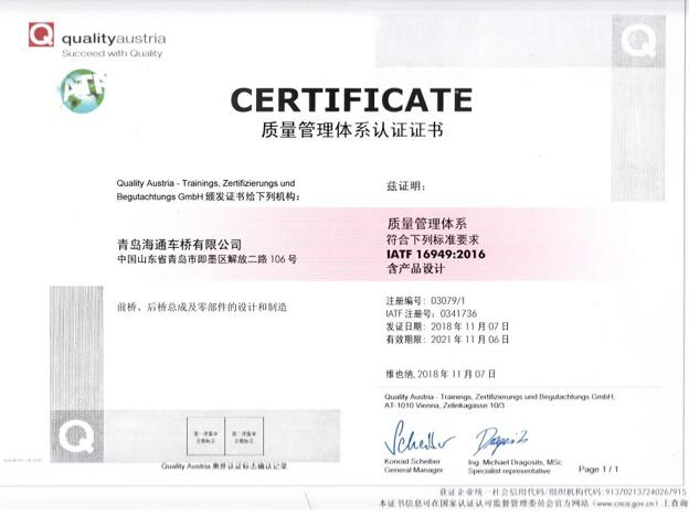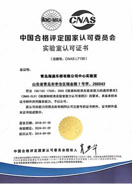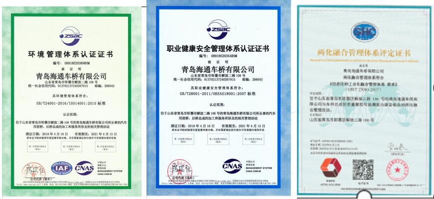 青島海通車橋有限公司成立于1994年,注冊(cè)資金2000萬(wàn)元,位于山東省青島市即墨區(qū)解放二路106號(hào)。公司先后獲得“中國(guó)誠(chéng)信企業(yè)”、“國(guó)家級(jí)認(rèn)可實(shí)驗(yàn)室”、“高新技術(shù)企業(yè)”、“山東省企業(yè)技術(shù)中心”、“山東省守合同重信用企業(yè)”、“山東省著名商標(biāo)”、“質(zhì)量信用AAAAA級(jí)企業(yè)”、“AAA級(jí)企業(yè)信用等級(jí)”等榮譽(yù)。先后通過(guò)了質(zhì)量、環(huán)境、職業(yè)健康安全、兩化融合等管理體系認(rèn)證。